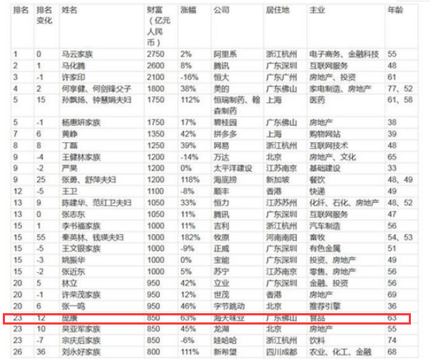 作为这家公司背后的掌舵者,庞康近年来屡次登上财富榜,且排名不断上升。2014年海天在上交所主板挂牌上市首日,就出现开了“疯涨”现象并触发了临时停牌,至少有32名公司的自然人股东成为亿万富翁。上市第4天,海天味业的市值就直逼当时589亿的五粮液。
