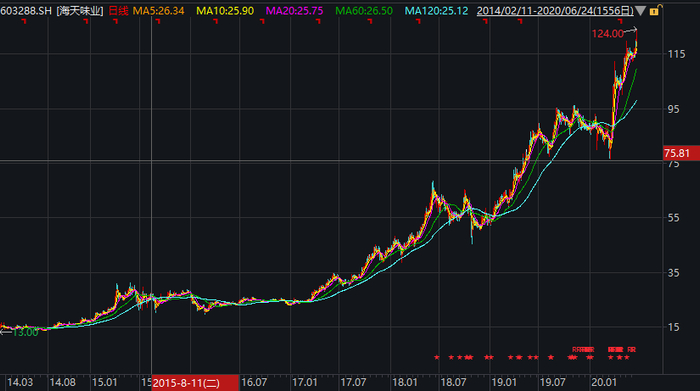 从最初的股价算起,到今天盘中创出新高,六年多时间里海天味业股价暴涨10倍。总市值一度飙升至4000亿元以上,成为行业“巨无霸”。