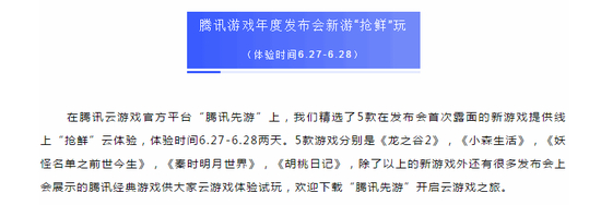 虽在整个发布会中篇幅占比不大,但腾讯云游戏还是给大家带来新游“抢先玩”的活动。具体来看,腾讯云游戏官方平台“腾讯先游”为玩家提供了包括《龙之谷2》在内的5款新游戏的“抢鲜”云体验,让玩家真正去感受“即点即玩”的乐趣。