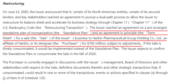 根据公告,GNC目前有两个重整方案,其中第一个为独立重整计划,第二个为出售计划。出售计划中,GNC及其多数现有有担保的债权人于临近公告前另与哈药集团就以7.6亿美元的价格向其整体出售GNC业务初步达成原则性意向。