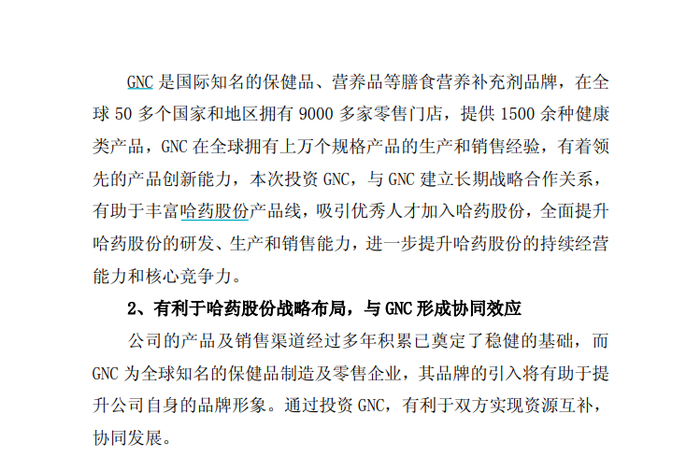 哈药股份当时的交易公告中,提到的投资GNC的意义。