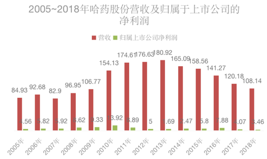 2005年至2010年,在哈药快车道发展的“这黄金五年” 攒下了大量财富。年报显示,从2005年到2010年,哈药股份净利润从4.56亿元增长至11.3亿元,2013年的营收更是高达180.92亿元,可随后哈药的业绩却直线下降,2018年营收仅达到108.14亿元,相比2013年营收,几近腰斩,净利润仅为3.46亿元,同比下降14.95%。