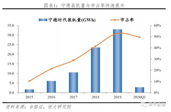 处于十年百倍的行业赛道中,宁德时代抓住机遇,从一个小企业迅速崛起成为国内锂电龙头。2015至2019年行业共出现三次重大变化:1)2015年推出白名单政策后,外资电池厂商暂时退出国内市场,留下市场空白;2)2017年开始新能源客车补贴大幅退坡,新能源乘用车市场爆发,带来电池技术路线由磷酸铁锂向三元切换;3)补贴政策继续向高能量密度、高续航里程的乘用车倾斜,使得三元电池逐渐向高镍化过渡。在这几个重要的产业变化节点,宁德时代凭借其快速扩张产能的能力和高效的产品研发及产业化能力,快速填补市场空白,市占率由2015年10.3%提升至2019年52.9%。