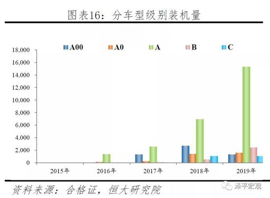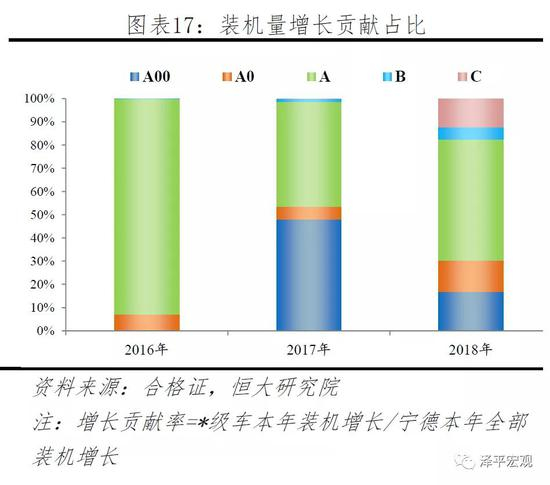 2017年起补贴政策向高续航车型和高能量密度电池倾斜,电池技术路线首先由磷酸铁锂向三元转型,这一阶段宁德市占率提升源于A00车型三元装机贡献。在我国新能源汽车发展初期,铁锂电池曾广泛应用于乘用车,2015年磷酸电池装机市占率达到了53%。2017年政策对低续航乘用车超额补贴,并首次对电池系统能量密度提出要求:250km以下车型单车补贴3.6万,250km以上车型均为4.4万,电池系统能量密度90(含)-120Wh/kg补贴系数为1倍。磷酸铁锂电池能量密度低的短板凸显,2017年铁锂装机市占率22%,同比下降22pct,三元则逐渐成为主流。2017年宁德乘用车装机量4.1GWh,同比增长2.7GWh,其中A00和A级车分别贡献1.3GWh和1.2GWh。值得注意的是,2017年A00级车型全行业装机新增3.1GWh,其中宁德新增1.3GWh,占比达42%,而宁德主要增长源于北汽EC180车型,达到1.1GWh。