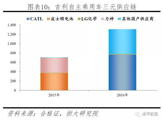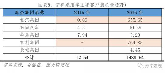 2016年宁德把握海外电池企业退出机会,打入一线车企供应链。2015年宁德乘用车领域主要客户为宝马,由于车企自身战略,整体装机量较低。2016年宁德装机量出现大幅增长,主要源于对北汽和吉利供应链的突破。其中北汽集团装机655MWh占比46%,吉利集团765MWh占比53%。2015年北汽和吉利三元主要供应商分别为SKI和波士顿电池,占比达到85%和53%。而2016年,白名单推出后其供应量向更多国产供应商开放,其中宁德供货占比达到了52%和58%。