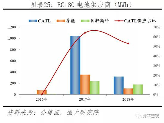 同时期二线企业由于缺乏短期内产能快速扩张能力,难逃边缘化的命运。北汽A00车型EC180就是一个典型的例子。这款车是2017年销量最高的车型,产量达到7.7万辆,其主要供应商为宁德,占比达到64%。而EC180在2016年电池供应商分别为孚能(75MWh,主供三元电池)和国轩高科(10MWh,主供磷酸铁锂)。2017年该车型装机量1.6GWh,而三元供应商孚能2016年和2017年产能分别为0.4GWh和1.3GWh,无法积极满足车企需求。