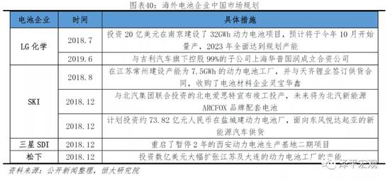 日韩动力电池巨头重返中国市场。2019年2月,发改委与商务部明确提出鼓励外资动力电池企业来华投资,6月工信部宣布提前废除《汽车动力蓄电池行业规范条件》,中国电池厂正式向海外电池企业开放。而早在2018年日韩动力电池巨头就加紧了重返中国市场的步伐。2018年7月,LG化学宣布投资20亿美元在南京建设了32GWh动力电池项目,并与华友钴业合资;同年8月,韩国SKI集团宣布在江苏常州建设产能为7.5GWh的动力电池工厂,并与天齐锂业签订供货合同,收购了电池材料企业灵宝华鑫;同年12月,三星SDI重启了暂停2年的西安动力电池生产基地二期项目;松下则选择大幅扩张苏州和大连动力电池产能。