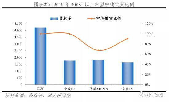 2018至2019年,随着补贴政策对能量密度要求不断提高,电池由低端三元向高端三元转变,宁德装机增长主要源于400km以上车型。2018年政策降低低续航车型补贴,提高高续航车型补贴,能量密度要求105Wh/kg:150-250km补贴由3.6万降低到2.4万,250-300km由4.4万下降至3.4万,300km以上补贴由4.4万上升至4.5万,一倍补贴的标准由90Wh/kg提升至120Wh/kg;2019年,补贴政策全面退坡,能量密度要求提升至125 Wh/kg:250km以下补贴全面取消,高续航车型地方补贴全面取消,国补也降低50%以上,1倍补贴能量密度要求提升至160Wh/kg。2017-2019年新车推荐目录中,电池平均能量密度由100Wh/kg逐步达到160Wh/kg。宁德率先量产NCM811三元电池且是当时唯一能大规模供应高能量密度电池的企业,在300-400km、400km以上车型装机市占率不断提高。2019年销量排行前10的车型中,共6款车续航超过400km,除2款比亚迪自供外,其余均为宁德主供,其中北汽EU5、上汽荣威Ei5全部电池均为宁德提供,广汽传祺AION.S和吉利帝豪EV宁德供应占比分别为67%和90%。