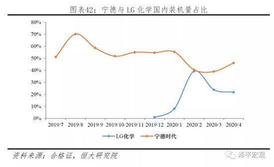 2020年以来,宁德在国内的份额出现明显下降。从2019年下半年,宁德装机量市场份额一直维持在50%以上。2020年2月,随着特斯拉的量产、LG的进入,宁德时代当月市占率下降15pct。与此同时LG市场份额出现显著上升,当月装机39%基本与宁德时代持平,此后3、4月维持在20%水平。
