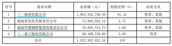 三一汽车金融的第一大股东为三一集团(持股91.43%),湖南信托持股3.75%,上市公司三一重工、湖南华菱钢铁集团分别持有公司3%、1.82%股份。