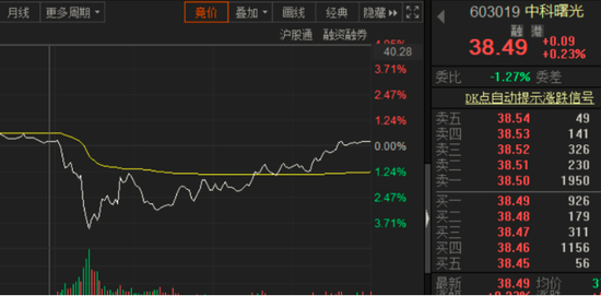 截至当天收盘,中科曙光由跌转涨0.23%,股价回升至38.49元/股,收复失地。