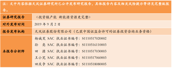 风险提示:镍、钴价格下跌的风险,海外投资不确定性风险,汇率波动的风险,新能源汽车产销量低于预期的风险等。
