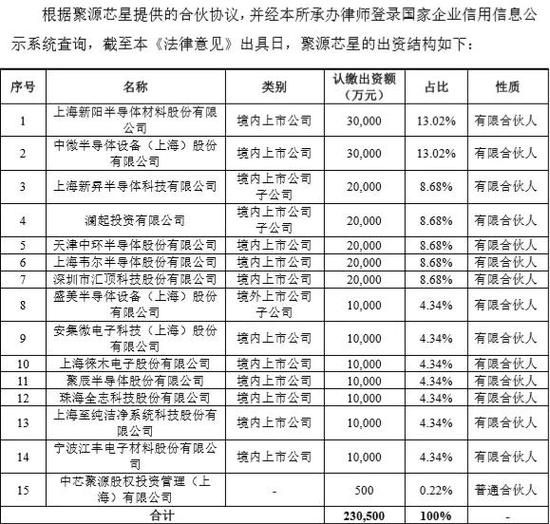 根据披露,聚源芯星的出资人包括上海新阳、中微公司、上海新昇(沪硅产业全资子公司)、澜起投资有限公司(澜起科技全资子公司)、中环股份、韦尔股份、汇顶科技、盛美半导体、安集科技、徕木股份、聚辰股份、全志科技、至纯科技、江丰电子等合计14家公司(或旗下子公司)。
