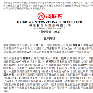 7月6日深夜,海底捞发布了一份盈利警告,指出因新冠疫情影响,其预计今年上半年收入同比降约20%,且还将出现净亏损。