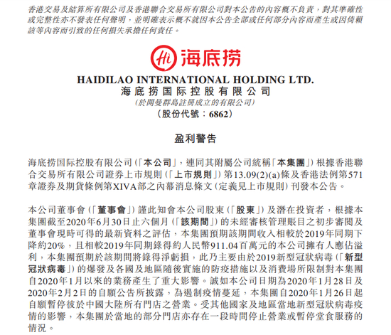 海底捞在业绩预告中称,这一业绩主要就是因疫情的暴发,各国及地区随后实施的防疫措施以及消费场所限制,对集团自2020年1月以来的业务产生了重大影响。