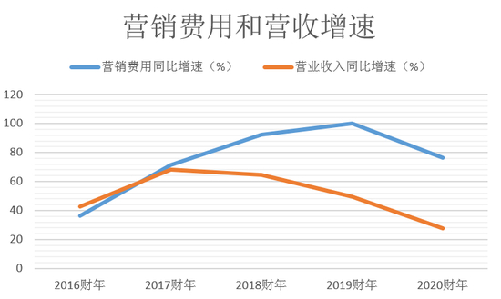 除人员和学习中心不断增加外,好未来也在不断的加大营销投入,但过高的营销费用成为2020财年发生亏损的直接原因。财报显示,2016财年到2020财年,好未来营销费用由0.74亿美元一路增加至8.53亿美元,占营业收入的比重由11.87%增加至26.05%。近三年的同比增速为92.14%、99.92%和76.20%,均显著高于营收增速。