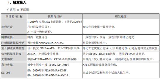报告期内,在研项目稳步推进,公司的注射用比伐芦定于获得了美国食品和药品监督管理局批准上市、2019年1月获得国家药品监督管理局批准签发的“注射用比伐芦定”《药品注册批件》,并已提交了一致性评价申报;注射用胸腺法新一致性评价申报材料已上报;生长抑素原料药工艺优化已完成、注射用一致性研究已按计划开始推进;依替巴肽注射液ANDA已回复完成,待审批。