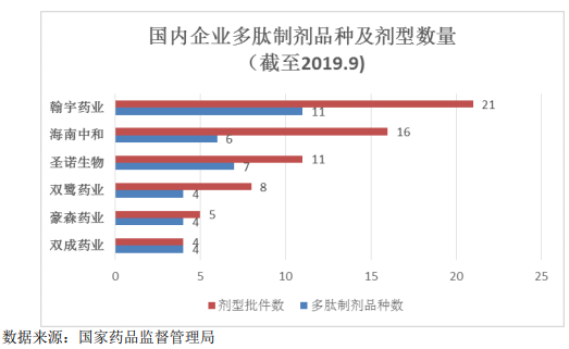 我国本土多肽企业有近百家,产品以仿制药为主,双成药业是规模较大的专业多肽药企,公司拥有丰富的化学合成多肽药物研发、注册申报、生产和市场营销经验,在中国市场已成功开发了4个化学合成多肽药物。多肽制剂品种数仅次于翰宇药业、海南中和、圣诺生物,与双鹭药业、豪森药业并列第四。