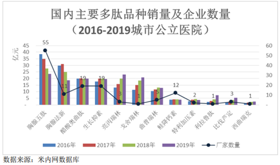 公司的4个多肽类药物中有3个国内生产厂家为两位数,胸腺五肽、胸腺法新、生长抑素国内厂家分别达到55家、19家、19家,此外,公司的比伐芦定国内生产厂家为3家。其中,胸腺法新市场较集中,双成药业的市场份额并不高,米内网数据显示,2018年中国公立医疗机构终端注射用胸腺法新销售额为29.08亿元,原研赛生药业占据50.58%的市场份额,地奥九泓制药占比20.78%。