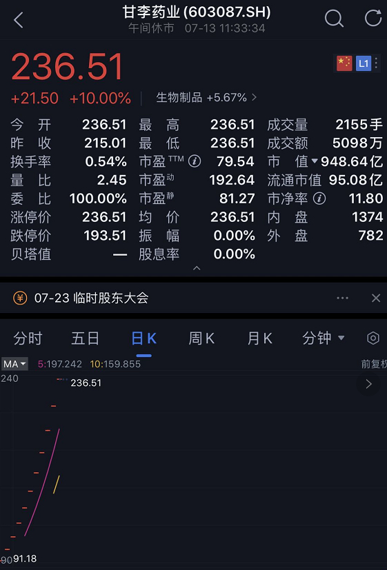 6月29日上市的沪市主板甘李药业,目前已经取得了11个一字连板,且仍未开板。甘李药业是国内重组胰岛素类似物生产领军企业,其发行价为63.32元/股,是今年以来发行价第三高的非科创板新股。高瓴持有甘李药业1815万股,占总股本的5.03%,为公司第5大股东。