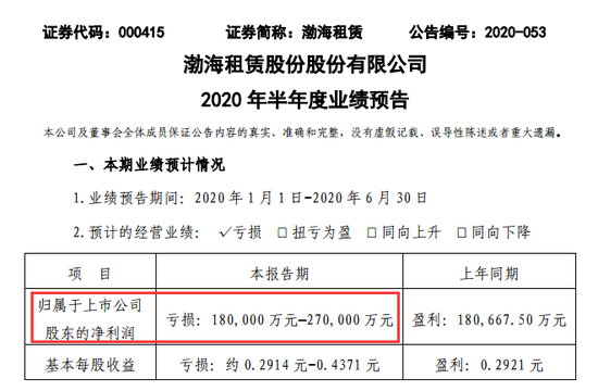 公告显示,渤海租赁预计今年上半年归属上市公司股东的净利润将亏损18亿元~27亿元!
