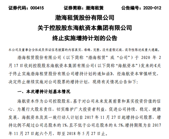 值得一提的是,海航资本及其一致行动人原计划自2017年11月27日起增持渤海租赁,增持比例不超过公司总股本的1%,且不低于公司总股本的0.5%,增持期限为自2017年11月27日起六个月。后因公司筹划重大资产重组事项,以及海航资本在卖出公司股票后6个月内不得再买入公司股票等原因,增持期限延期至2019年2月28日止。