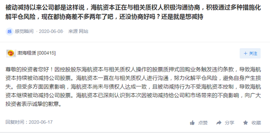 在深交所互动易平台上,也有投资者对这一系列被动减持行为提出了质疑。公司回答称:“受多方面因素影响,海航资本尚未与债权人达成一致,且被动减持行为不受海航资本控制,导致海航资本继续被动减持公司股票。海航资本已深刻认识到本次因被动减持给公司和市场带来的不良影响,向广大投资者表示诚挚的歉意。”