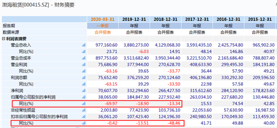 Wind数据显示,渤海租赁在2018年之前盈利相当强劲,每年扣非归母净利润的同比增长幅度均在40%以上。不过,这一增长势头在2018年戛然而止,2018年年报显示,扣非归母净利润同比下跌超过48%;2019年跌幅放缓,同比下跌13.51%。