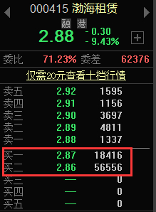 渤海租赁(000415,SZ)今日跳空大幅低开超4%,随后跳水逼近跌停,随后保持横盘窄幅震荡,一度触及跌停价位,最终收报2.88元/股,跌幅9.43%,成交量小幅放大至122万手,创出近2个月新高。截至收盘,跌停板价位的买一和买二档上共计有74972手,累计折合约2100万元。