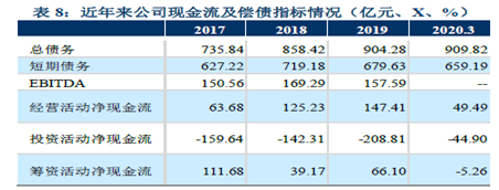 具体到财务数据,公司经营性现金难以覆盖资本性支出,较大的资本性支出进一步推高公司财务费用。2019年末,公司总债务增长至904.28亿元,其中短期债务占75.16%,财务费用为30.14亿元,占当期净利之比为142%。以上财务数据或已反应了公司采取的“垂直整合”策略遭遇的压力。