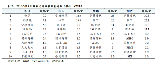 从动力电池上,比亚迪相对早于宁德时代。2017年之前,宁德时代装机量还不敌比亚迪。自2017年,宁德时代一举超过比亚迪跃升电池动力龙头。2019年宁德时代装机量是比亚迪近三倍。值得一提的是,比亚迪的装机量由2016年的第二名下降至2019年的第四名。