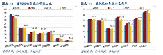 2019年公司超级市场实现营收166.50亿元,营收占比为33%;连锁超市实现营收95.93亿元,占比19.01%;奥特莱斯营收75.65亿元,占比14.99%;购物中心营收69.87亿元,占比13.85%;综合百货营收52.36亿元,占比10.38%;便利店营收19.25亿元,占比3.82%;专业专卖营收7.73亿元,占比1.53%,各业务中专业专卖毛利率最高为26.72%,超级市场、购物中心、便利店、连锁超市毛利率分别为21.38%、21.12%、20.61%、19.18%,连锁百货毛利率为15.00%,奥特莱斯毛利率最低为12.85%。