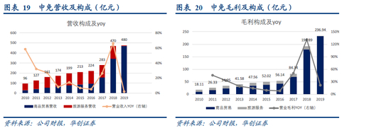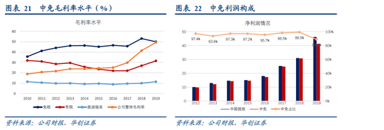 2019年之前公司有旅行社业务,营收贡献100亿+,净利润贡献小于5000w,2019年2月公司剥离旅行社业务,聚焦免税主业。2018年、2019年免税收入分别为330亿元、460亿元。中免贡献95%以上净利润。(2019年处置旅行社贡献7亿元+的净利润)。公司2019年营收479.66亿元(+2.04%),归母净利润增长49.58% 至46.29亿元,扣非后归母净利润增速为21.79%达到38.29亿元。