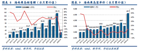 随着疫情的逐步控制,叠加海南旅游业刺激、促销策略,旅游市场恢复迅速,离岛免税也开始扭负为正快速增长。2020年5月海南离岛免税销售增长148%达到19.77亿元;6月预计环比有所上升。2020年海南离岛免税政策大幅度、大力度放宽,消费回流时代开启。7月第一周离岛免税新政下免税购物总额4.5亿元(日均购物游客约1万人次左右,销售额约6400万元)。