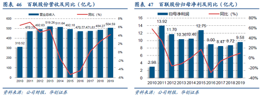 公司是百联集团旗下核心企业,旗下覆盖百货,超市,大卖场,便利店,购物中心,品牌折扣店,专业专卖店等业态,相对控股联华超市股份有限公司。截至2019年底,公司共运营15家综合百货、18家购物中心、6家奥特莱斯、141家大型综合超市、675家超级市场、662家便利店以及89家专业连锁店,总经营建筑面积为474.07万方米。2019年公司实现营收504.29亿元,同比增长4.20%,归母净利9.58亿元,同比增长9.87%。2019年公司综合毛利率为20.88%,同比下降0.05个百分点。