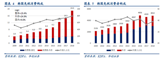 2018年我国国内免税市场销售额约为395亿元,海外免税消费规模超过1800亿元(为国内4.5倍有余),占全球免税市场销售额近34.8%。2019年我国国内免税消费预计500亿元左右。2018年韩国免税消费额中外国人占比约80%,我国代购贡献预计约一半。