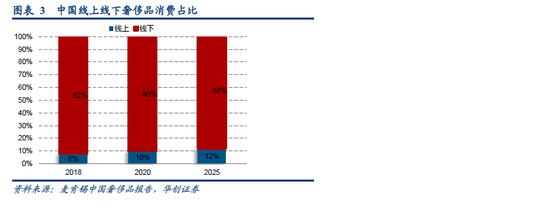销售渠道方面,2018年线下渠道消费占比为92%。因奢侈品消费情感属性重,线下购物体验(店内服务 + 产品体验)为消费溢价的重要部分,线下仍然是消费者首选的奢侈品购买渠道。