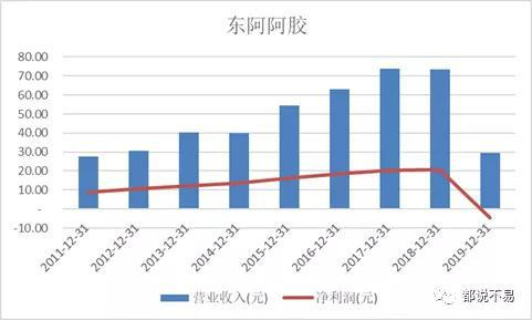根据东阿阿胶2019年的年报,公司2019年度实现营业收入29.59亿,亏损4.454亿元,与最高峰2017年的73.72亿元收入,20.44亿元净利润的辉煌相比较,可以说是走出一条直线下滑的曲线。