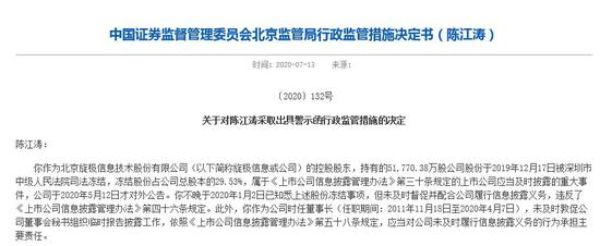 7月13日,北京证监局披露对陈江涛采取出具警示函行政监管措施的决定。