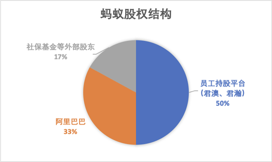 然而,财联社记者根据工商登记信息查阅,蚂蚁共有三部分股东:最大股东是员工持股平台君澳和君瀚,合计持股50%;其次是阿里巴巴,持股33%;最后是外部战略投资者,其中最大股东全国社保基金持股2.9%。
