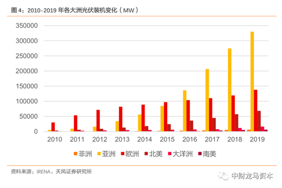 2、亚洲、欧洲、北美光伏发电装机量增长迅速