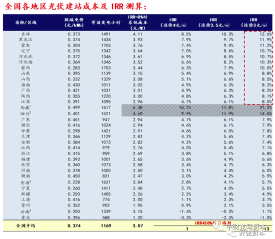 2)取全部地区的平均数,全国光伏平价上网项目的门槛为3.07元/W。