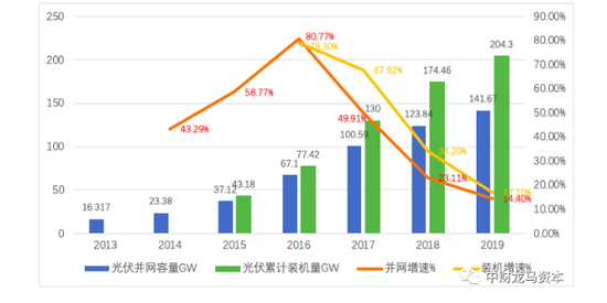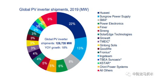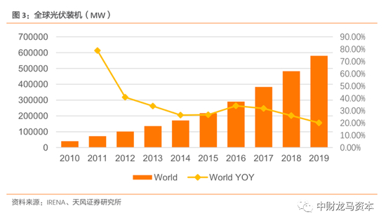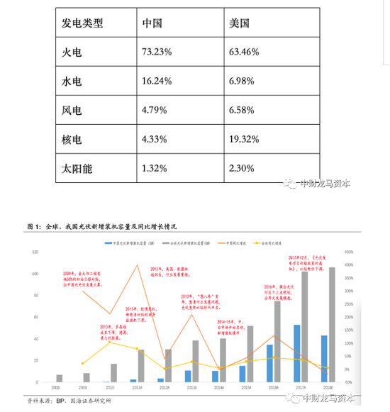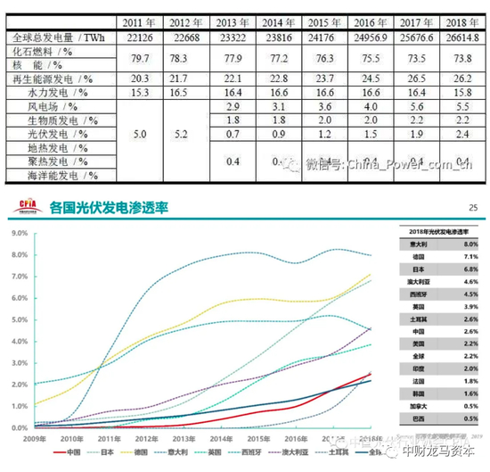 1、在全球电力生产结构中,光伏发电占比2.4%,低于风电5.4%的占比。虽然全球光伏累计装机量小于风电,但是在2019年新增可再生能源装机量中,光伏占比55.4%,高于风电33.5%的占比,全球光伏发电装机量增长率20%明显高于风电10%增长率。因此未来光伏占全球电力结构中的比例将持续提升。