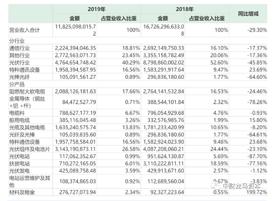 公司2019年实现营业收入38,709.79万元,较去年同期的38,417.28万元基本持平,但各业务收入占比发生较大变化。其中,分布式光伏电站投资运营(自持分布式光伏电站)、光伏产品研发和制造及分布式光伏项目开发及服务(为客户开发分布式光伏电站)业务分别实现主营业务收入27,313.20万元、8,573.38万元、2,441.47万元,占主营业务收入的比重分别为71.26%、22.37%、6.37%。各业务收入与去年同期相比分别增长30.15%、124.37%、-81.76%。盈利能力较强的自持分布式光伏电站业务收入大幅增加,占营业收入比重持续大幅上升;光伏组件在保障自用的基础上,通过拓展海内外市场,对外销售收入较上年大幅增加,占营业收入比重上升;较低毛利率的分布式光伏项目开发及服务业务收入减少,占营业收入比重下降。