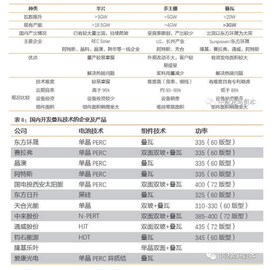 7、太阳能电池片和组件位于产业链中游,降本增效压力较大,但这也促使部分拥有先进技术的公司脱颖而出,例如叠瓦技术的领导者江苏塞拉弗公司。