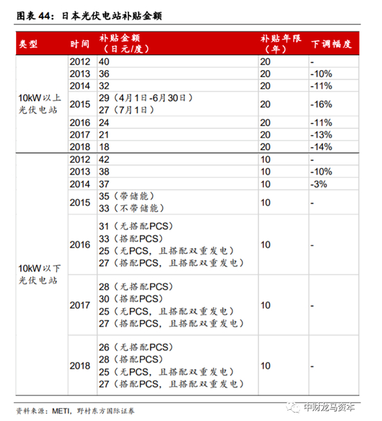 日本光伏发电快速发展的原因在于其高昂的上网电价补贴政策,居民的上网补贴电价高达42日元,相当于人民币2.57元。日本高额补贴新能源主要是因为2011年的福岛核电危机,所以日本民众和政府都特别重视新能源,特别是太阳能发电。日本光伏分布式发电应用广泛,不仅用于公园、学校、医院、展览馆等公用设施,还开展了居民住宅屋顶光电的应用示范工程。