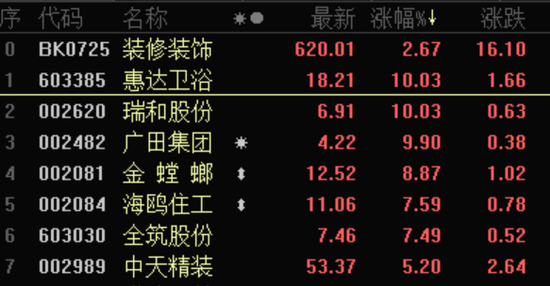 财联社8月10日讯,装修装饰板块午后崛起,龙头金螳螂录得三连板,惠达卫浴、瑞和股份、广田集团等多只个股涨停。全筑股份、海鸥住工、中天精装等个股涨幅居前。