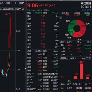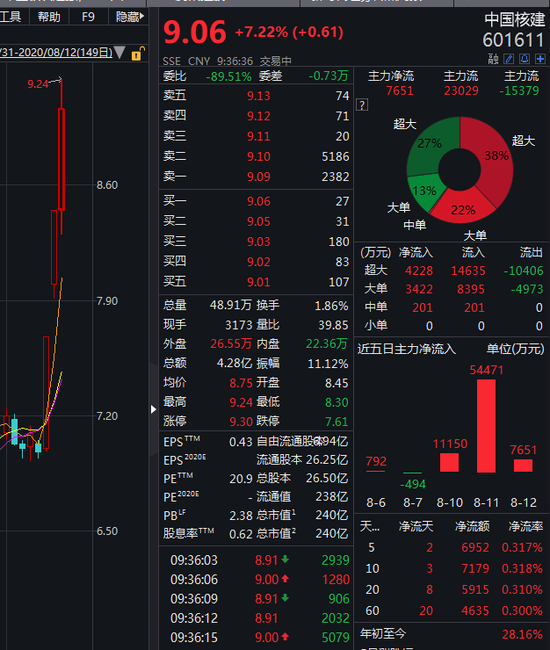 受此利好,核电核能板块近日逆势走高。2 连板中国核建,今日开盘后一度接近涨停,截止发稿,报 9.06 元,涨 7.22%。