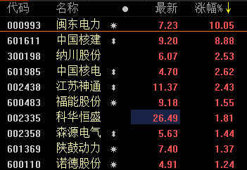 此外,核电板块内,闽东电力涨停,纳川股份、福能股份、中国核电等跟涨。