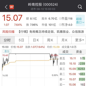 受上述利好消息影响,今日岭南控股高开高走,盘中一度涨停,不过尾盘出现震荡。截至收盘,岭南控股报15.07元/股,涨7.64%,最新总市值为101亿元。